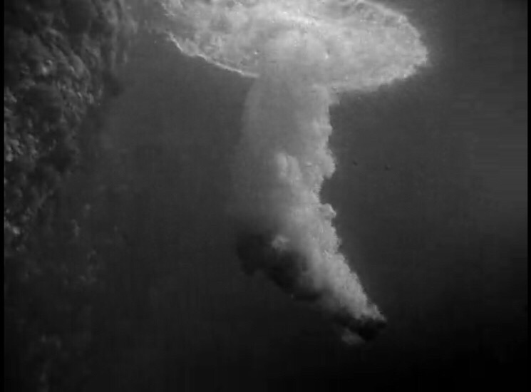 The underwater camera work is fantastic, and is one of the instances of black and white photography almost certainly being the better option, as it allows for sharp contrasts and clearer delineations of objects while in a disorienting position (similar to the earlier moment of vertigo while on the bridge). The perspective shot as we sink to the bottom is exceptional.